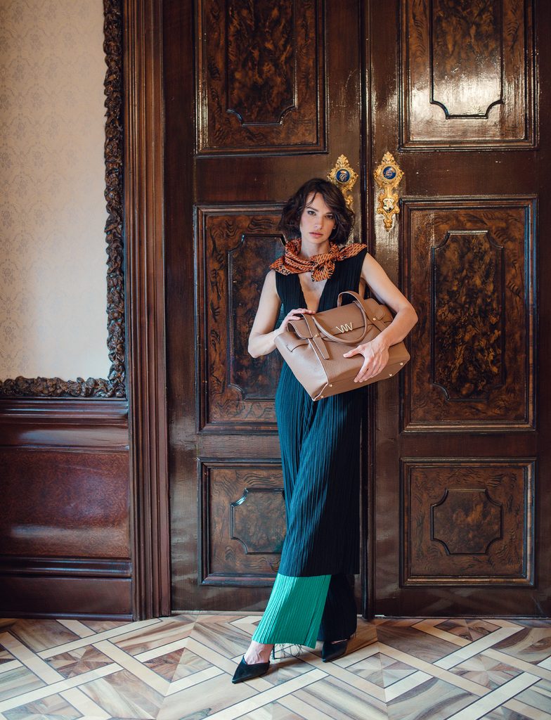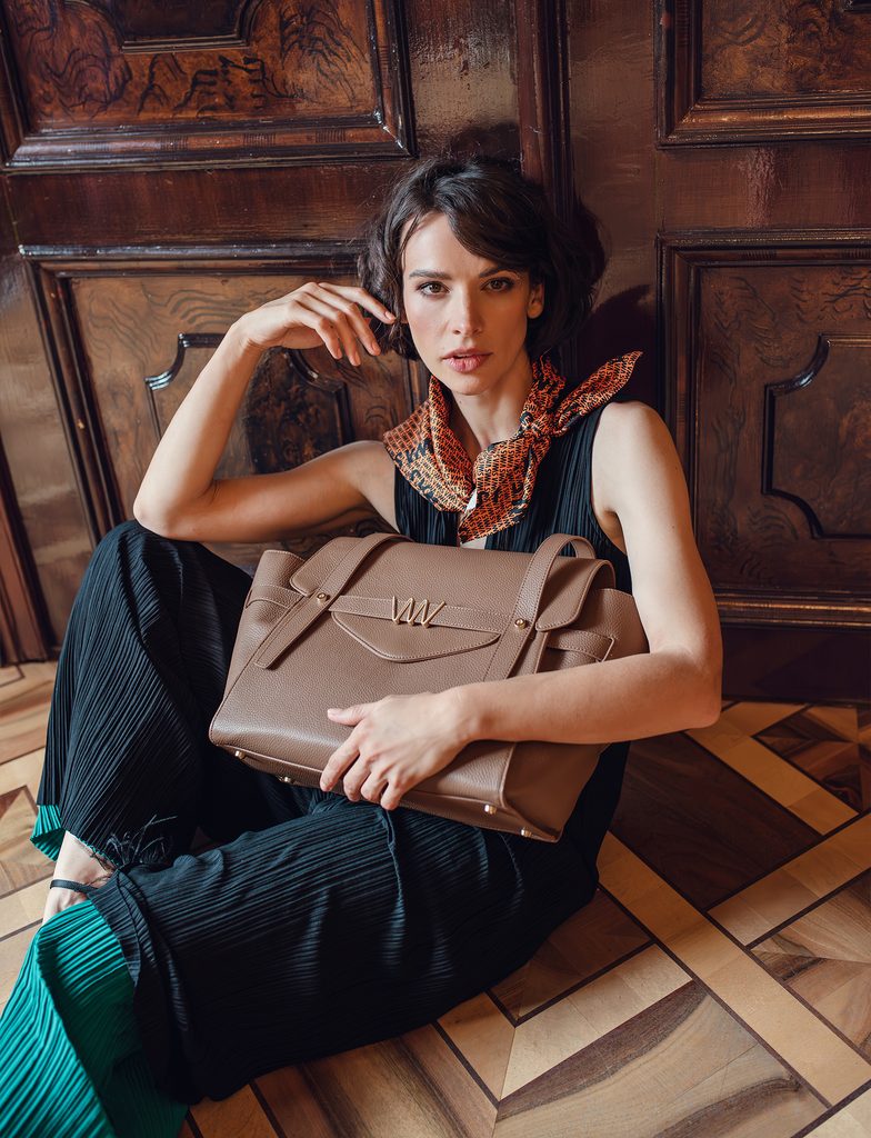 Außergewöhnlicher Stil der Handtaschen, die die Meinung und Energie der Besitzerin widerspiegeln. Aurora Rosa (rosa-orange) bringt Energie und Eleganz italienischer Sonnenuntergänge über toskanischen Hügeln, Émeraude Ciel (grün-blau) die Essenz des Pariser Charmes, oder Midnight Dune (schwarz-beige), die das Geheimnis von Städten wie New York oder London in sich trägt, Sakura Ino (türkis-lachs) verbindet die Zartheit der Kirschblüten mit der Ruhe der Seele und der Schönheit der Vergänglichkeit, Noir (schwarz) ist die Essenz von Ruhe, Kraft und Stil, der keine Worte braucht, um zu beeindrucken, und Heritage (braun) ist für die Frau, die mit Eleganz voranschreitet.