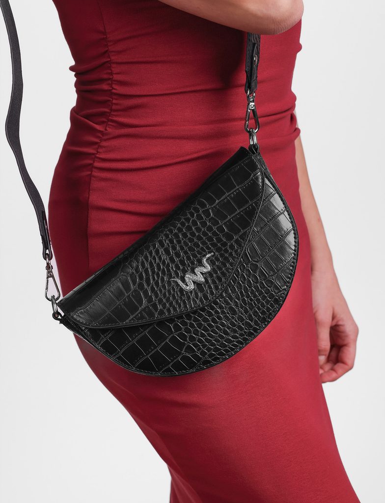 Tricia Kaiman Black ikonische Crossbody-Gürteltasche mit Krokodilprägung
